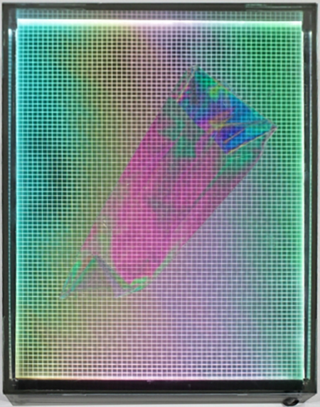 As a viewer approaches the LED lightboxes of Chicago artist Jeroen Nelemans, shimmering, neon colors shift from turquoise to fuchsia to violet. Nelemans, whose practice has long explored the ways that light and the digital experience affect our perception of images, is here dismantling and manipulating the technology that’s ever present in our daily lives: the LED backlighting of our computer, television, smartphone and tablet screens. Notably, Nelemans’ manipulation of this technology isn’t about exploiting errors in the media or delighting in the glitches; rather, the artist amplifies the aesthetic potential that is latent within these materials.