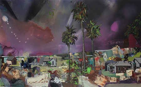 McCaw uses a camera he himself fashioned to act like a magnifying glass. In black-and-white landscape photos, the sun’s heat is intensified by the camera such that its path is literally burnt into the photo. This lends a powerful physicality to the ghostly images, which provokes reflection on the profound impact of the sun. These are both rough and quiet works, the raw burn mark cutting through the serene landscape. Conner’s photographs amount to sublimation on aluminum. These works were created in Italy and capture details of the circa 1500 woodblock for "Bird’s Eye View of Venice," created by Jacopo de’ Barbari. These seductively dark but highly detailed images effectively draw draw the eye to them. A pair of landscape paintings by Bercea add a welcome flash of color to this otherwise color-subtle show. These are abstracted and partially fabricated oil-on-canvas landscapes, rich with depth and movement. He uses color to punctuate the space, which combined with the dynamic composition keeps the eye active and engaged.