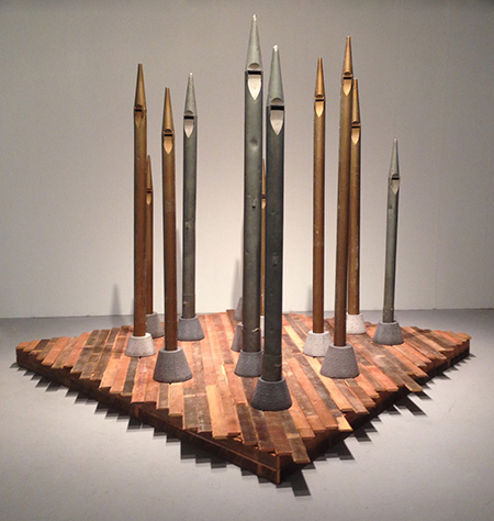 At this moment in time, as the tensions over white-dominated society’s preconceived notions of black male identity are coming to a head in our national dialogue, DC-born, Chicago-based artist Jefferson Pinder creates works that address the multifaceted nature of blackness. From the violence and tragedy of the suspended billy clubs of “Gauntlet,” to the fierceness of Obama’s angry eyes recreated in neon in “POTUS,” to the heroism suggested in the organ pipes of “Moriaen’s Shadow,” Pinder approaches each of these differing aspects with a simple, poetic clarity.
