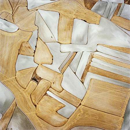 That said, Maisel doesn’t consider himself a documentarian, and rightly so. Maisel shoots from a moving vehicle in the sky, where it’s windy and noisy, a situation that doesn’t allow for the same image to be taken twice. Flying is also expensive, and thus time is limited. So inasmuch as Maisel can have a plan of where to shoot, the images are spontaneous. Whether a direct product of this or not, they have a painterly feel, and the compositions are as much or more about color and form as they are about recording a place. Adding to the painterly quality are the repeated traces of earth movers and tractors and other farm equipment, which appear like brush strokes from this elevated vantage point. Once shot (these were taken in 2013), Maisel can then spend months meticulously building up the pictures layer by layer — much like a painter. The final and exceptional results are luscious colors in complex and detailed compositions.