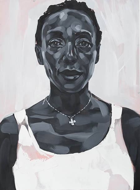 Campbell’s paint handling in these portraits mirrors the sharp psychological force of the subject’s personality. Each woman is painted in such a boldly restricted palette and with such an arresting directness of mark that almost everything traditionally alluring is stripped away. We see only their completely clothed bodies from the chest up. Their faces are graphic and almost sculptural, seeming to coalesce out of shaped liquid planes of compounded greys. Bodies and hair are often made with gestures so quick and spare that flashes of bright pink or muted rose sometimes burn through like underlying residual radiation. What we feel from these women is not softness, but power.