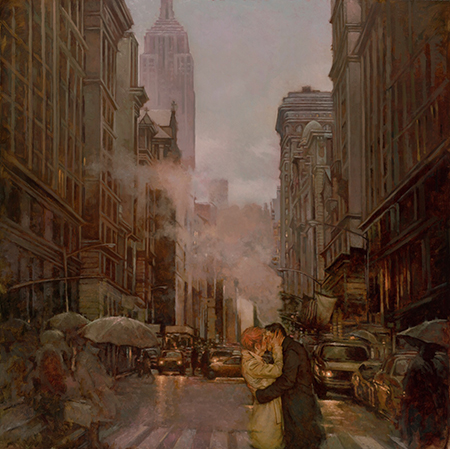 “Lovers in a Dangerous Time” capitalizes on Lorusso’s additional skills in urban landscapes. Here, the tall buildings along a busy, big-city street seem to press in on an embracing couple, who are seizing the moment to kiss even though they are in a crosswalk. The “danger” could be the traffic, the mysteries of the relationship itself or the larger context of the historical moment. Lorusso cites masters of figurative painting from the turn of the 20th century among his influences, and it’s evident he knows how to give the genre a 21st-century vibe.
