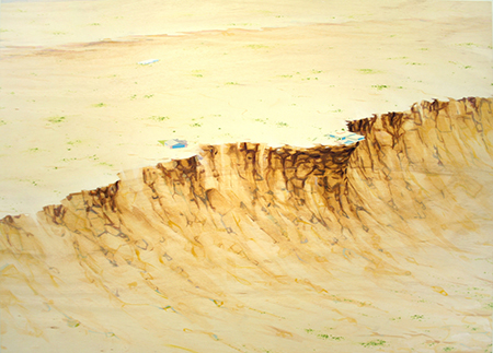 Chris Ballantyne's suburban pseudo-dystopias are easy to get, though still fun to look at. He depicts ranch-style homes, subdivisions, cul-de-sacs and parking lots encroaching upon nature, even as they are encroached upon through the implicit impact of global warming. His seductive style, highly graphic with subtle and seemingly effortless painterly flourishes, has changed little over the last decade. Many of the paintings are executed with acrylic directly onto un-primed panels, a process that entails getting it right the first time, and he always does. Ballantyne's newest landscape subject is that of atolls.