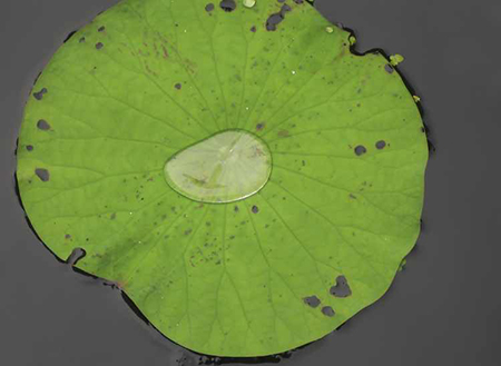 Barbara Edelstein works with plant life, especially leaves, which she depicts in radiant drawings, photographs, and sculptures. Like her mother, Barbara deploys black Chinese ink to draw the natural world. But whereas Jean sees the landscape from a panoramic distance, Barbara finds details, close-ups, especially the fallen leaves we would normally overlook or dismiss. One of her foliage drawings focuses on the center of a leaf from the tropical plant Colocasia, commonly known as elephant's ear. Lacy black lines alternate between thin (the point of the brush) and thick (the side of the brush) to create a dramatic, undulating texture. Unlike her mother (who depends largely on black lines with color for highlights), Barbara glories in color. Some of the photographed leaves have a rich magenta tone that sparkles against the velvety darkness of the background. The sculptural leaves are hot pink and chartreuse and lush azure blue: fragile translucent forms balancing on spindly metal stems.