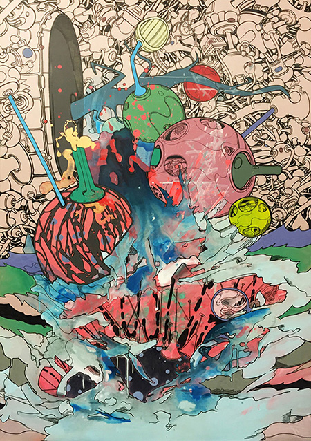New York-based Tang Wei Hsu, the youngest among the artists on view, experiments with biomechanical illusionism to suggest what lies beneath the surface. In the artist’s statement, the work explores “the relationship between the miniature and enormous.” This manifests most visibly in his earliest works, “Device Through the Macrocosm 1 & 2” (both 2007). In each, amoeba-like holes in sky-blue skeins reveal complex networks of fantastical space-age machinery that conjures a surreal envisioning of mechanized human anatomy. More recently, there is a re-ordering to the compositional structure. Where the earlier work suggests enlarged microscopic views of anatomical forms, the latter works evoke a sense of environmental chaos, with machine-like forms invading into amorphous, brilliantly colored landscapes.