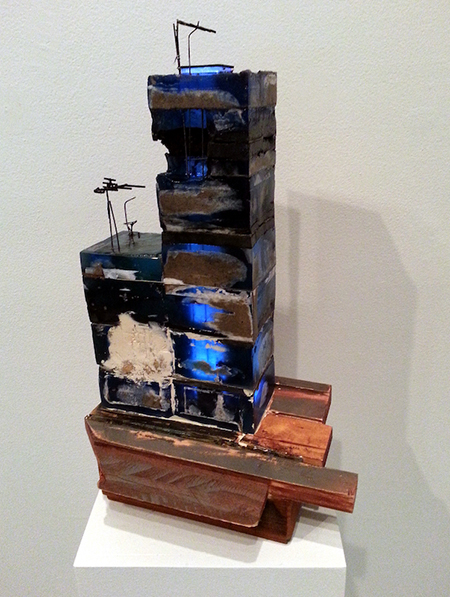 Banes, who hails from a family in the construction business, builds small sculptures that read as architecture under construction or in the process of destruction. He considers “architecture as living entity,” subject to “origin and decay.” “The speed at which this life-cycle revolves in our own area is influential in my work.” The eccentric models that he fashions from found or bartered materials (including LED lights) serve, to quote gallerist Danielle Fox, as “metaphors for shelter and home as something that is not fixed but is moving and shifting through time.” "Chalet" depicts a small house or cabin as a transparent framework of joists and beams that clings to the wall like a mountaineer with ropes and bracing. “Bystander" is a seemingly scorched, blackened skyscraper or apartment block from which protrudes spindly metal structures — are they antennae or weaponry?