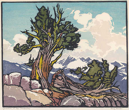 While “Night — Yosemite” (1925) is serene, with a twinkling starry night reminiscent of Whistler’s “Nocturnes," “Blue Gums Berkeley” (1917) features attenuated trees that stretch tall into a blue sky filled purple clouds, all gloriously backlit. Rice’s view of nature is heroic, dignified, and ultimately benevolent. “Guardians of the Timberline” (1924) features two trees, one felled but the other standing triumphantly atop jagged rocks, a snowy mountain range and roiling clouds in the distance. Humans are decidedly absent which, to contemporary viewers well aware of our deleterious impact on nature, evokes a no-doubt unintended melancholy and nostalgia