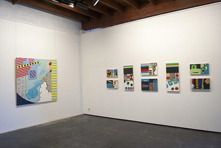 “Oceans” (2007) embraces many of Lee’s recurring characters, which together add up to the show’s central theme. Along the right side of the composition are colorful patterns of boxes, circles, and stripes. On its left are irregularly shaped colored planes that form an abstracted ocean that bobs up and down. But the painting’s essence is in the upper left corner. A far away, small white ship on the horizon slowly moves forward. It heralds the artist’s constant anticipation of the arrival of the unexpected and unknown. Its cargo brings the results of the artist’s commitment to creative inquiry.