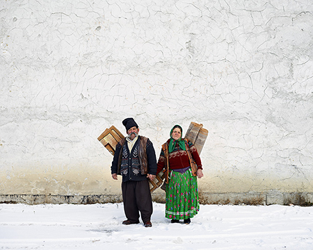Particularly arresting are Dezso’s images of people. "Carpet Sellers (Pojorata)” centers on an older couple, stout and dressed in layers of various patterns and colors. They stand on snowy ground in front of a large wall with a white, cracked surface. Holding hands and carrying their wares on their back, they are frozen in mid-walk as they go about the business day. The ground is green but the sky still grey in "Ileana (Fata Rosie, Batrana)." Here, an older woman stands front and center, dressed to stave off a chill, holding handfuls of apples; the background is blurry. Again, the subject is captured in the midst of an action, this time gathering fruit. These images then are both portraits and genre scenes that depict the everyday activities of the people the artist encountered. The variety of slice of life, observational and emotional scenes depicted demonstrate Dezso’s efforts to understand and process the world he is investigating. While close to it, this is not his homeland. He is a curious observer, creating a nuanced whole by viewing through his lens from a number of perspectives.