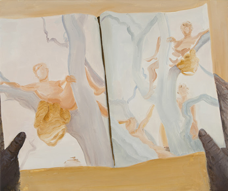 Brown also explores human-animal relationships. Several paintings reference Lucy (1964-1987), the chimpanzee raised like a human child. Her “parents” taught her to dress herself, sit on a chair at the table and eat with utensils, and look through magazines. It is documented that not only was she not interested in mating with other chimps, but she found humans sexually attractive. In “Playgirl (Frottage),” Lucy uses her finger to stroke a naked woman in a pornographic magazine. In “Lucy and the Skyhawks,“ the primate holds an Australian magazine from the same period with a centerspread of the members of a boy band sitting in a large tree, bare-chested and wearing animal skins. In one of Brown’s explicit pen-and-ink drawings, a chimp sexually engages with a vacuum cleaner. Several nearby paintings document Brown’s partner’s dog with the artist’s underwear. After Brown moved in with her boyfriend, his dog not only hoarded her underwear but chewed the crotches.