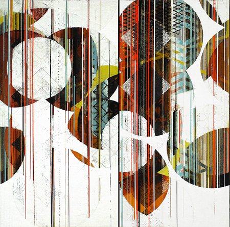 Nina Tichava's mother is an artist and designer who worked for the luxury clothing company Char. The label, founded in Mexico in the late 1960's by Charlotte Blankenship de Vasquez, was known for its bright, Southwestern patterns and lavish leather handbags. Santa Fe artist Tichava brings these influences marching into her mixed media work with dazzling motion. She layers pigment, paper and resin to build compositions full of intersecting stripes and polka dots. The large works leap from their display in the gallery's expansive windows, like haute couture gowns from the 1960's that have been deconstructed and stretched onto panels.