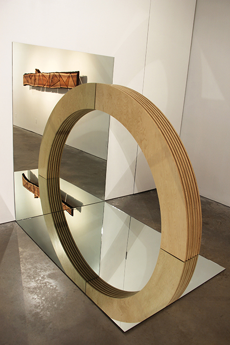 Ron Ulicny exercises free rein in an installation and the results are impressive. The title, “Xylotheque," is taken from the Greek words xylong, meaning wood, and theque, meaning repository. Hence, the gallery has become a repository for large sculptures made from various types of wood that is manipulated in intriguing ways. Ulicny’s skill with wood and other complementary materials is clear in the major pieces “Sleepers (Here We Are),” “The Great Arc (Realization)” and “Ellipsification (Negativity)/Ellipticity (Positivity).” For “Sleepers,” he sanded, polished and coated the center portions of six railroad ties with polyurethane, which makes them look almost gilded in contrast to the roughly textured dark-brown ends. The ties are arranged parallel to one another atop a bed of dark-red lava rocks, evoking a short length of railroad track there to accommodate a ghostly train. “The Great Arc” places a constructed arc of lacquered birch on a mirror on the floor; thus the arc appears to be a complete circle. A second wall-mounted mirror reflects the illusory circle as well.