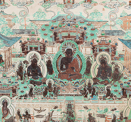 From the 4th century until their abandonment in the 14th and subsequent 20th century revitalization, a string of Buddhist cave temples on the edge of the desolate Gobi dessert, near the oasis of Dunhuang, served as a social, cultural, commercial and religious crossroads. It linked East with West on China’s Silk Road. Hand carved into the cliff face of alluvial conglomerate rock that runs along the Daquan river, the walls of the caves were plastered in a mixture of clay, sand and plant fiber as a ground for colorful, ornate paintings created primarily as forms of Buddhist devotion leading towards promises of a better after-life. The original caves currently attract more visitors than they can safely accommodate without deterioration.