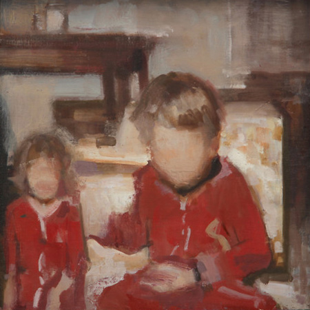 Opdenbrouw transposes the melancholy of old photos to the eternal present. The mysterious characters in his oils derive their specific poses, settings or clothing from photographs, but become, when integrated into his painterly world, symbols of unknowability. The mother and child in “The Window” stand before a hearth below the photo or painting of a man who seems to observe them, from the virtual space behind the glass. The parents with young daughters in their laps in “TV Party” embody, judging by their clothing, the 1950s; the quartet in “Family 1983” seems likewise both immured in a specific time, and timeless. “Fading,” a sepia-toned rendition of two women posing outside, and “Generations,” with its trio of a grandmother, mother and daughter, are meditations on memory and time. “Little Man,” “Awo” and “Birthday Presents” depict young children with similar nostalgia and pathos. Opdenbrouw’s families, their fugitive images hovering between photographic accuracy and painterly improvisation, become universal surrogates: Everyman and Everywoman, holding still for a second, peering into the camera and out to the future, fixed and transfixing.