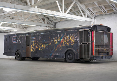 Kenny Sharf’s “Daisymobile” has a flower and fish motif, right down to daisies on the hubcaps. The delightful, pastel redesign of a 1975 Pontiac Gran Ville includes Swarovski crystals and diamond dust. Sterling Ruby’s “Bus” is a behemoth, dark and ominous with its caged interior seating and massive sub-woofers and speakers lit by florescent light. Will Boone’s “Car” is a custom Chevy Blazer, whose cargo bay has been transformed into a red lit bedroom that’s adds a new dimension to the Los Angeles stereotype of living in one’s car. Milan-based design shop Garage Italia Customs is represented by several customized creations prepared specifically for this show.