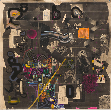If Hardgrave’s explorations of collage and painting take their modus operandi from Synthetic Cubism, they add the contemporary-materials touch of “acrylic toner transfer printing,” which I interpret as a marriage of digital imagery and acrylic gel, The fifteen paintings on panel and paper included here are abstractions with stylized figurative elements — personnages that play nicely with the contemporary sensibility as well as the art historian’s desire for context. This work could comfortably cohabit walls with Klee, Dubuffet and Picasso. The backgrounds of the paintings are black (though not a uniform blanket of paint), against which the brightly colored figures stand out in contrast, like butterflies flitting through sunbeams. “Mizzenmast,” with its doily-patterned standing and seated figures; “Ceylon,” with its Goya-like giant; “Jamon,” with its caricatured couple; and “Shrine of the Battlecry,” with its sword-wielding warriors and jazzy composition (Stuart Davis meets Paolo Uccello), confirm Ben Shahn’s judgment about art ancestors: they’re not your enemies; they can be helpful, whispering friends.