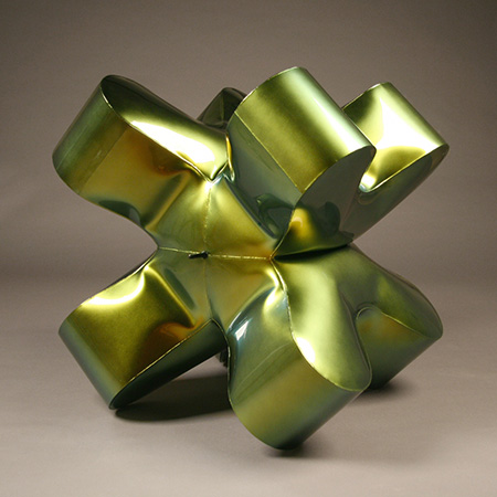 William Cannings is experimenting with new shapes executed on a larger scale and finished with dazzling colors. “Arc” and “Centered” are variations on a simple, life-sized stick figure with an inflated inner tube for a head. Measuring just over five feet, they stand guard in two different areas of the gallery – impassive, pensive, totemic. Like many other pieces in the show, they are painted with iridescent Kameleon paint, which shifts color depending on the light and angle of viewing. There are several different colors involved in Kameleon paint, and this particular piece ranges from a rich copper to a vivid purple; small indentations in the surface emphasize these color shifts. The tour de force in the show is “Applejack,” a symmetrical piece shaped roughly like a jack (as in the child’s game, ball and jacks) and painted a luscious Kameleon green with undertones of copper. The title is obviously associative, inspired by green apples and the shape of the piece, but Applejack also refers to a Scottish immigrant who came to New Jersey in 1698 and was involved in the production of a Scotch he named Applejack. Cannings was born in England but sometimes wears a kilt to his openings, a nod to his Scottish ancestors.