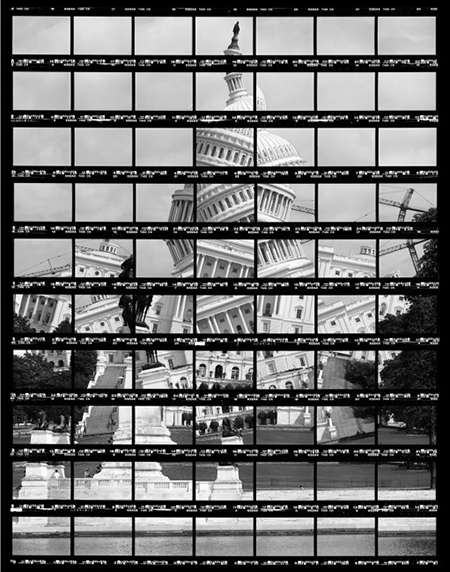 Near the entry to Thomas Kellner’s show there’s an image of the United States Capitol Building. Or rather, 70 photographs brought together to form a topsy turvy view of the iconic structure. Arranged on a contact sheet, the grid of images explodes the building into a Cubistic fortress. The piece brings to mind the impossible architecture of M.C. Escher, or the off-kilter facades of Peter Bruegel the Elder’s “Tower of Babel.” It also, inevitably, reads as a comment on the fragmented state of our political discourse. Throughout the exhibition, Kellner seems to slip comments on current or historical events into his work. He pries the Eiffel Tower apart in a series of black-and-white grids, transforming it into a many-headed snake and an imposing pyramid. If Jean Jullien’s painting of the tower as a peace sign represents that embattled city’s aspirations, these works capture its dark, complex reality. A view of Big Ben à la the Leaning Tower of Pisa evokes the rupture of Brexit, and a rippling Golden Gate Bridge recalls the city’s earthquake-riddled past.