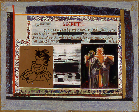 Of all of Mesches' projects, the one that probably achieved the widest reach and largest impact was his series "The FBI Files," which traveled extensively. I had the privilege of bringing it to the Contemporary Arts Center, New Orleans in 2004. The exhibition consisted of collages that Mesches made using the documents that the FBI had kept on him from the McCarthy Era through the 1960s. In the 50s, the young artist worked on Hollywood sets, while maintaining his own studio practice. With Hollywood under attack by McCarthyites, he became a conspicuous target in the eyes of the FBI.