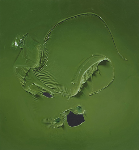 If there were a never-ending race over the arc of art history to achieve the best tromp l'oeil, Paul Sietsema would currently hold the lead. In this, a consideration of style is key. In his case, this isn't mere photorealism, and yet, Sietsema executes with such an understated tour de force that this precision grounds our overall impression. The paintings and drawings (there are also two projected film loops) are immersed in the tricks and contradictions of representation. Even "Green painting," an enamel on linen which initially appears to be an abstraction, is actually a depiction of a skein of forest green paint, a chorus of gouges, crinklings and separations rendered with staggering craft. "Telephone painting," featuring a white rotary-dial phone with detached receiver, coil and a curled cord, as seen from above and lightly floating in its own 'pool’ of a matte enamel background (perhaps the 'rug' on which the 'pool' lies), is a personal favorite.