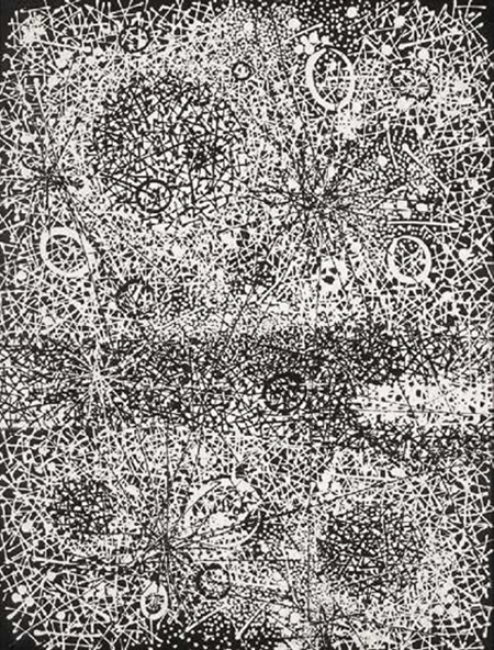 By the 1960s, Onslow Ford had become inspired by Jackson Pollock's drip painting process, and he adopted his own variation of it using a personal calligraphy that he called "line-circle-dot.” As a longtime champion of automatism, Onslow Ford  believed that the line, the circle and the dot were the fastest forms one could make, and were thus the most purely automatic. When he flung paint onto canvas, he directed his arm movements to build compositions using only these three elements. In black-and-white paintings such as "Basic Language" (1961, previously titled "Egyptian Eyes No. 2"), which I selected for the 1979 exhibition "Black and White are Colors: Paintings of the 1950s-1970s" at the Galleries of the Claremont Colleges, Onslow Ford articulated his mature vision of what he considered to be the "inner worlds." Using a newly developed aquapolymer paint, he was able to compact layers and layers of his calligraphic notations to form a personal conceptualization of an infinite universe, where matter is synonymous with spirit.