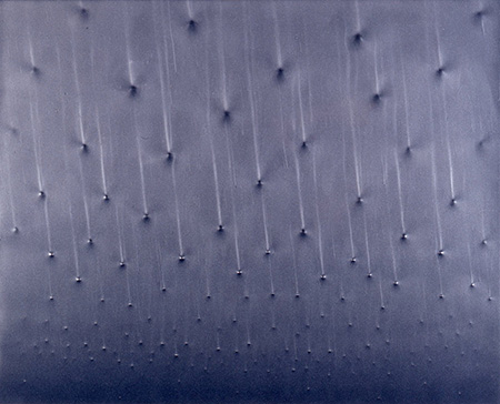 Another example is the visual playfulness of New York artist Jason Young’s “Silver Tap” (2004), in which he mixes acrylic paint with resin on alloy to create what appear to be numerous pods or bumps moving across what is in fact a flat, silver-blue surface. Viewers can’t help but think that the bumps are protruding from the surface, but it’s a trompe l’oeil effect that turns the coolness of metal into a warmer, organic surface and invites thoughts about nature.