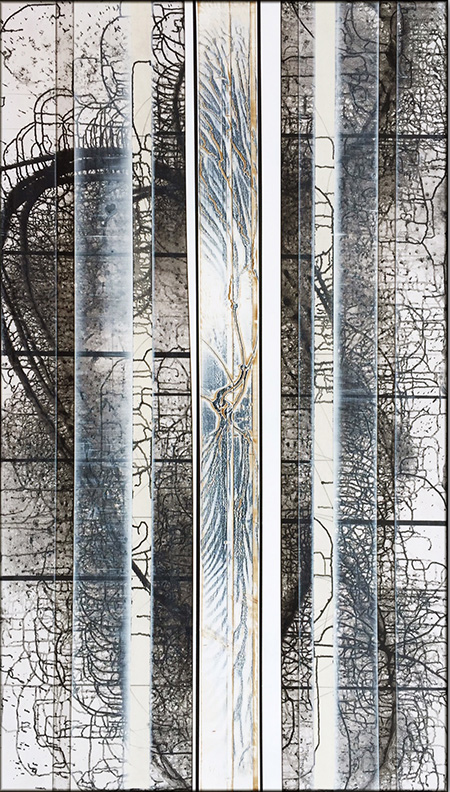In the “Traction and Cross Over Series” — five oblong panels each stretching to 7 feet tall — Kessler superimposes blocks of white paint onto variegated fields of neutral colors and black curlicues. With the subtle translucency of the white blocks, however, no part of the composition is truly hidden, implying harmony and connection among the disparate elements. Throughout the paintings, juxtapositions just work: textured versus flat surfaces, defined shapes versus gestural strokes, and light versus shadow.