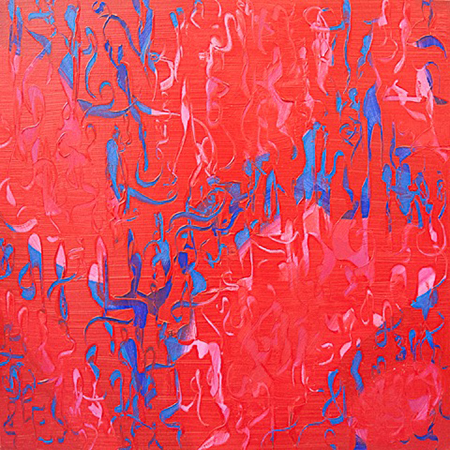 "French Kiss" and “Spellbound” feel like close-up views of swirling forms in blue over a red background, with a blue wash playing a prominent role in the second painting. These contrast wonderfully with two stunning horizontal pieces: in "Shifting Energies" the reed-like forms in red resemble columns of flames burning vertically from one end of the long span (20 by 60 inches) to the other. The flame forms jet out from a central section and reach the edges of the canvas toward the top and bottom. That central section represents the energy source for the flame-like tendrils, which Cardenas paints in an icy hot blue-white, like the flame on the tip of a blow torch. In an artist statement she remarks: “painting allows me the opportunity to see reality with a clear vision … all art is real, based upon physical dimension and limitless possibilities of current imagination.” The repetitive gestures and forms of this series do credit to the views expressed in the artist's words and the exhibition’s title. On these canvases the infinite and cosmic are expressed perceptually, flowing in and through Cardenas' abstract world.