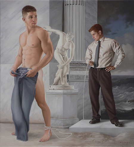 In an effort to screen them from homophobic social culture, one of Hempel’s predecessors, the late Tom of Finland, was effectively forced to publish his beefcake depictions of attractive, muscular young men in physical fitness and exercise magazines. Hempel turns instead to presenting his contemporary males as objects of desire by cleverly introducing them into validated, familiar looking, old master art historical settings. There he suggests that he is “able to imagine (and allow viewers to imagine) a past that includes rather than excludes gay experience by riding the coattails of art history's imprimatur.