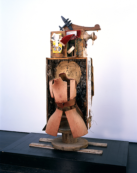 George Herms, "Greet the Circus with a Smile," 1961, mannequin torso, wood, feathers, tar, cloth, paint, ink, torn and cut papers, photographs, newsprint, printed reproductions, metal, wire, plastic, glass, string and mirror, 68 x 28 1/2 x 20". The Menil