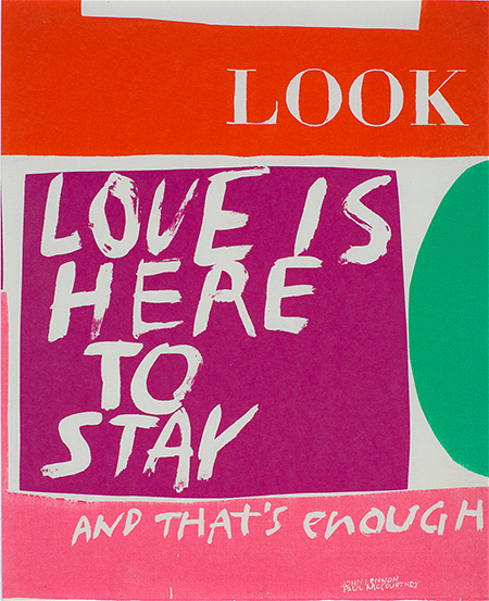 Kent and the others, of course, were not working in a vacuum. They were clearly in tune with the zeitgeist that spawned the ongoing proselytizing for peace by the Beatles (the names Lennon and McCourtney [sic] appear on Kent’s print), who reminded us over and over again that "All you need is love … and in the end, the love you take is equal to the love you make." It is encouraging that Kent is receiving her due here and elsewhere, as she recently had major retrospective exhibitions at The Frances Young Tang Teaching Museum and Art Gallery at Skidmore College, The Andy Warhol Museum of Art, and the Harvard Art Museums.