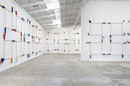 To create "1000 Brushtrokes," Joe Zucker dipped 1000 industrial mops into buckets of different hues of Benjamin Moore paint. Using primary, secondary and mixtures of those, as well as black, white and gray, Zucker presents an system of colors that progress from single, to double, then triple and quadruple dips. The single and multi-colored mops are then configured into modules of four that are bolted together where the brush meets the handles — delineating the shape of a square.