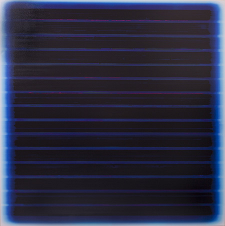 In his 2015 show, titled “Stripes,” Bolles, who had formerly built up his color abstractions slowly, alternating intricate brushwork with multiple glazes, began using a computer in order to execute what might be considered his underdrawing — in the digital building blocks of zeros and ones. These characters remain visible here and there beneath the color he applies later, implying, not for the first time, that mathematics is the underlying reality. Bollles synthesizes digital and traditional painting techniques to create hypnotic fields of color. Three square-format acrylic paintings on canvas, “15 Bars in Magenta,” “15 Bars in Blue,” and the slightly smaller “13 Bars in Blue” read as dark, soft-edged registers overlapping colored backgrounds, as if blurred by overwritten text. We associate such minimalist subject matter (with its mystic, transcendentalist implications) with hard-edged, machine-perfect facture. As Bolles’ painterly ‘handwriting’ becomes clear, the texture of the canvas remains evident as well. Transcendence and mystery are inscribed in these modernist manuscripts, both dark and luminous.