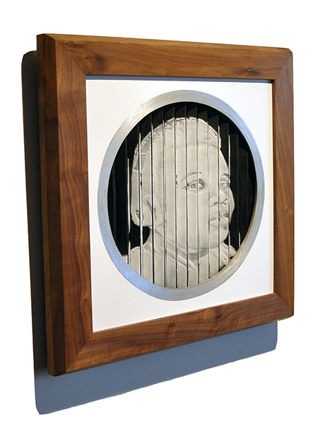 Sonya Clark gets straight to the point with “Unraveled Persistence.” A Confederate flag juts out from the wall, its weft threads gone but pooling on the floor. Nearby is “Afro Abe Progression,” in which Clark stacks seven $5 bills onto a plaque. Each bill bears an “Afro” of black thread in various sizes on Lincoln’s head. Dialogue about racism’s deep history is inevitable. Charlotte Potter addresses racial divides with three lenticular portraits on glass of men familiar to us by virtue of recent clashes between young African-Americans and police officers. “Lenticular American, Brown/Wilson," for instance, is a portrait of Michael Brown when viewed from the left, and policeman Darren Wilson when viewed from the right.