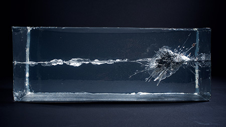 A few of the works turn to gun violence and war imagery, with most attention going to a collection of seven clear rectangular blocks on pedestals and a related video — all having to do with the symbolic rivalry between the Soviet-designed AK-47 assault rifle and the American-made M16. What would happen if the guns were aimed at each other and the discharged bullets fused in mid-air? The seven gel blocks are evidence of the experiment, encasing the bullets in motion, to surrealistic effect.