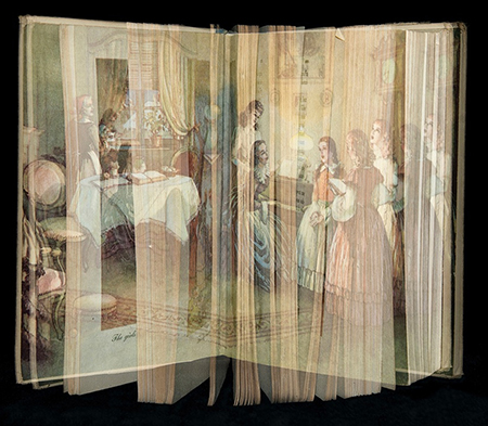 Ellen Cantor’s “Prior Pleasure”, is a delight for these kinds of people, who appreciate and have an appetite for books and everything that goes along with them — storytelling, book illustrations, aesthetics of font style, and their very physicality. The show displays Cantor’s photographs of children’s literature from “Robinson Crusoe” to “Huckleberry Fin” to “Nancy Drew” to “Little Women.” She employs a double exposure technique done in the camera (not in Photoshop) to allow the viewer to see the illustrations and the text at the same time. Through this, the books appear both transparent and veiled. The effect is to create a sense of nostalgic reverie that references the feeling of flipping through a book’s pages. Playfully, Cantor sometimes turns things around by accentuating the illustration in a book that mostly consists of text. At other times, she only allows the title page to emerge. Overall, it’s a charming show that reminds us how the first books we’ve read stimulated our imagination and taught us about social justice and other values.