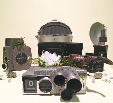 Rhonda Wheatley, "Dream Journeying Device," 2017, vintage clock radio, two vintage film cameras, vintage camera, vintage vacuum tube, quartz crystal cluster, goat horn, pyrite chips, and crystal grid, 12 x 22 x 22". Photo by Robin Dluzen