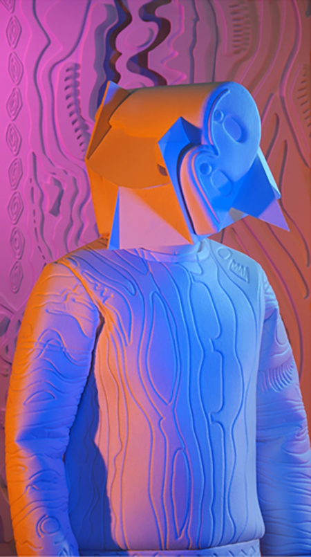 With "In Lieu of Flowers Send Memes,” Brian Bress' work has evolved to the next level of sculpture-becoming-video-becoming-painting hybridity. At any given moment in the viewing of one of his hi-def, wall-mounted video pieces, the fully costumed (perhaps you can call it "puppet-ed") character, bathed in a warm pastel light, exists along a short spectrum of stillness. This is alternately still enough to make the work stand as a digital painting, or else rotating very slowly, turning it into a moving video picture — albeit one that emphasizes its sculptural nature, both as a video/painting and in its actual presence in the room. It's this ambiguity, the oscillation between still picture and moving image, that Bress has especially honed, and it marks the apex of his oeuvre.