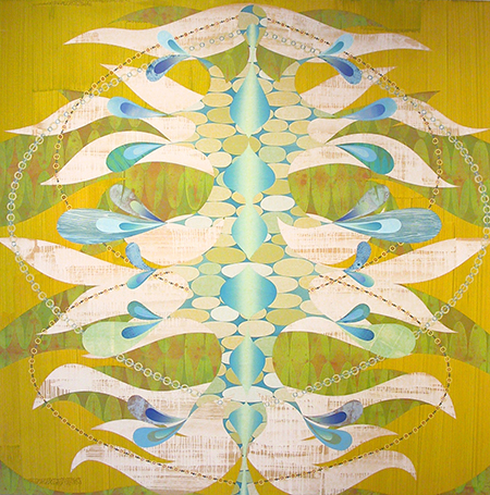 This larger show, "We Are All Made of Light," comprising some thirty works on canvas and paper, along with some archival prints, includes one wall-filling work, “Wall of Sound” (1995-2000). Comprised of some five hundred page-sized individual collages, it is a convincing demonstration of Ray’s range and versatility. It helps argue the gallery owner’s case that Ray was “the hardest-working artist I’ve ever met.” The combination of dedication and talent shines through, in the large floral canvases “Rosathoria,” “Lichina” and “Clavaria,” with their stylistic hints of Aubrey Beardsley, Friedensriech Hundertwasser, and Spiro-Graph and Spin Art. “RR 19” and ”Isidia” are baroque-hallucinatory Rorschach tests. The psychedelic mandala “Phaedoarubas” symbolizes and evokes the drug experience, much as Fred Tomaselli’s collages do, but without the actual contraband. Ray just sticks with paint and cut paper, exquisitely arranged and assembled. If our bodies emit light, through bio photons, as scientists postulate, Ray shows that artworks radiate too.