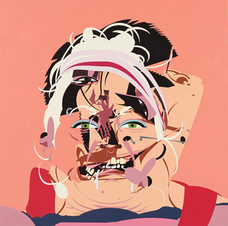 Working in sign enamel on canvas over panel, Finley’s “Drool, Snatch, Clean and Jerk #1” is a layered succession of geometric facial images caught in a tooth-baring grimace. “Drool, Snatch #1” depicts a single face bisected and fragmented. The artist’s color palette is pink, red, white — and bold; eyes pop out in green and brown. These are the colors of flesh, strain and achievement. We can feel the struggle of the weightlifter, almost hear the howls of achievement.
