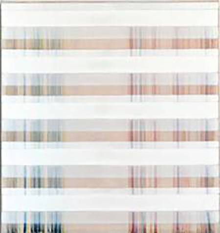Ross allows thin streams of earth-sourced mineral pigment (mostly in pale but vibrant yellows, reds, and blues) to drip naturally and vertically down the canvas. These rivulets are intersected by thick horizontal white bands, which are painstakingly layered in thin, even strokes. Rather than causing the subtractive process of erosion, Ross uses water and pigments to create a living tapestry on the canvas. Each painting takes several years to complete. Ross explains, “[t]he drips are a direct response to a particular situation I’ve been in, the landscape. Usually it’s a pre-Columbian site. It could be canyons, it could be hanging gardens, but it’s something that has affected me.” The paintings have a sculptural quality to them as well. From a frontal view they appear organic, with the linen canvas adding texture to the hundreds of layers and lines of pigment. But viewed from the side the paintings look as though they have been polished to a high sheen.