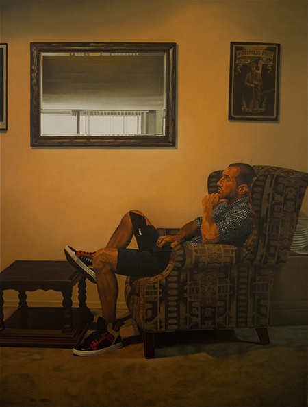 The richly detailed figurative oil paintings of Alex Blas’ exhibition, titled “In Your Room,” capture contemporary subjects rendered in lovely, detailed, traditional portraiture. Blas asked his friends to pose, placing them in everyday settings. “I asked them not to change anything, not to clean up, dress up, or pose,” the artist relates. The results are startlingly beautiful and possess a universal appeal that reveals youthful subjects, primarily men, in easily identifiable circumstances. Blas’ friends sprawl on a sofa, study a laptop in bed, towel themselves dry after a shower, and are caught in the moment of getting dressed. These intimate and graceful images are filled with light and life, with even the smallest detail — a record album, empty beer bottles, tangerines in a bowl or the fabric on a faded arm chair — rendered with full attention to detail. We are able to experience intensely personal and private moments that are shared with grace.