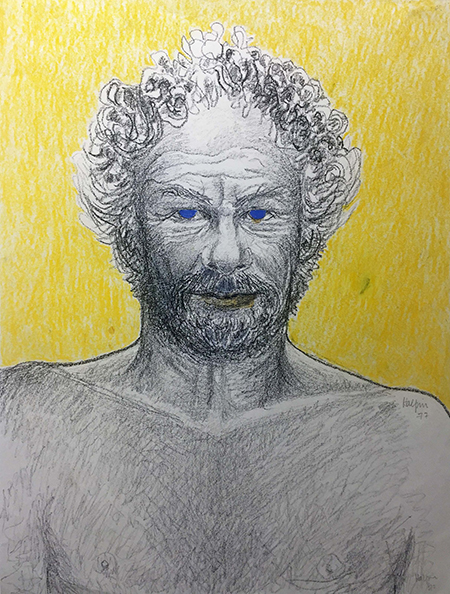 There’s a range of personal work here, some of which are autobiographical. A loosely-rendered watercolor depicts two men playing pool under a yellow light in an untitled work from 1944. This was the year he served in the U.S. Navy, so these men with their short buzz-cut hair and baggy pants were probably sailors. One of the most delightful of the early works is a Miro-like, pen-and-ink abstraction “Sunday Afternoon” (1953), full of dancing lines and squiggles. Halprin’s wife was the famous postmodern dancer/choreographer Anna Halprin, so there are drawings and paintings of dance settings and bodies in motion. “Portrait of Annie” (1948) shows a a series of overlapping line drawings of her posing nude. Later they built a deck overlooking a pine forest for dance, as shown in the pen and ink drawing, “Dance Deck, Kentfield” (1985). A “Self-Portrait" (1977) presents Halprin with unruly hair and beard. While the drawing is mostly monochromatic, he colored in his eyes with a marine blue, and the backdrop is yellow. The artist is shirtless, showing off his broad chest, and a faint curl of a smile sits on his lips as he looks directly out of the frame of the paper.