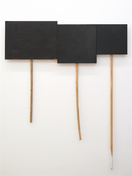 “ZB3, Stacked Glyph” (2014-16) is a good example of the older polyptychs, but much more somber in its deep layers of black and other under-colors like navy blue. “Redact #2” (2014) and “3 Square Sign Glyph #1” (2015) are more intimate, works on paper that hold their own but could act as studies and explorations of the original placard-stick idea. There’s a whole legacy of modern paintings that are all-black: Kasimir Malevich, Ad Reinhardt, Frank Stella. Hurley has added his chapter, bringing such an approach of restraint and withholding into the current century.