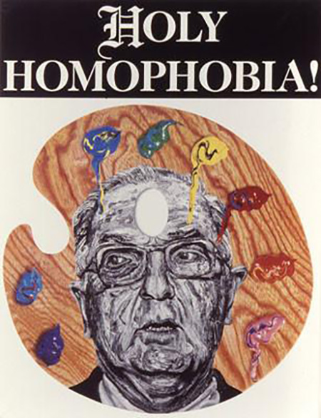 Additionally, Conal's use of language is every bit as precise and effective as in works by those who are better known than he is as political text artists within the contemporary art academy, such as Jenny Holzer or Barbara Kruger. Conal's lithograph "Holy Homophobia" (1990), for example, shows a prune-faced Jesse Helms in front of a painter's palette from which paint spills onto his forehead, along with the title phrase. A response to then-Senator Helms shaking up Congress over homoerotic photographs by Robert Mapplethorpe, the work combines words and imagery with superb efficiency and visual potency. To this day it remains an iconic historical marker that has gained fresh relevance, considering we now have an even more extremist Congress and homophobia (along with other forms of hatred) is once more on the rise.
