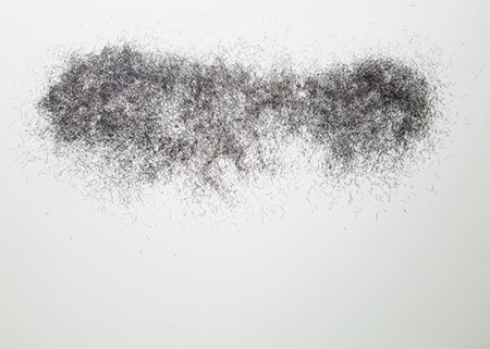 John Adelman’s artistic skills are fully in evidence in eleven new drawings completed this year, each executed on canvas in gel ink and acrylic. They illustrate a wide range of formal approaches through which Adelman follows a strict set of rules to achieve his pictorial goals. This might be regarded as conceptualist process, but the result of his meticulous technique feels more important than the actions used to complete the pieces. He repeatedly uses text and certain shapes like nails traced on the surface while taking a tally. Many of the pieces, like the ethereal “38724," have the number of nails rendered over the surface as their title. From afar the nails look like a dark cloud or smoke hovering over a white background. As we move closer to the work, it becomes clear that the thousands of nails are discernible, creating depth and texture.
