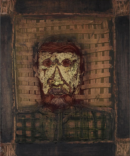 The self portraits that comprise this exhibition go beyond biography to take a profound and honest look at the man. “My Birth,” painted in brown and beige hues with silver and gold leaf, displays Toledo as he comes into the world. Instead of presenting himself as a newborn, however, he appears matured, suggesting his spiritual birth as an artist and the social-humanitarian purpose he was born to serve. An untitled self-portrait (2017) executed in muted colors, presents him in a dark-blue shirt with a golden pattern, deep forehead wrinkles, and disheveled hair, sitting at a desk reflecting and gazing at a self-portrait within the painting. He appears to wonder why he’s painting himself or what he wants to reveal on canvas.