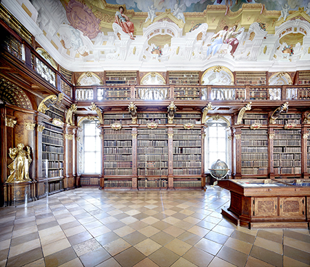 Candida Höfer’s current exhibition, titled "Spaces and Places," shows the conceptual photographer — who was a student, like Andreas Gursky and Thomas Ruff, of Bernd and Hilla Becher — continuing her examination of empty architectural spaces. Among the fourteen color photographs on display are five large-format works, formally composed, often frontally or even symmetrically, that deliver beauty and power, with only a hint of social critique. Höfer’s depictions of these grand institutional spaces — libraries, palaces, and symphony halls — exult in glory and grandiosity, but also implicitly question their functionality or permanence. These a0re habitats without inhabitants, like museum reconstructions of Renaissance palazzi.