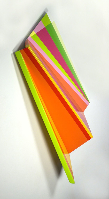 This exhibition of Rachel Hellmann’s newest pieces displays two distinct bodies of work within the same spatial context. She refers to her object-like wooden structures as "Sculptural Paintings," a series begun in 2012; and to contrasting flat yet related works as the "Paintings on Paper," a series begun in 2013. What they have in common is a dependence on pattern with a hard edge geometric style. Titles reference the qualities acquired by paper and wood after the artist has reorganized the shapes and surfaces, such as "Apparent Motion" and “Resiliency." Hellmann lives and works in Terra Haute, Indiana where she took up residence in 2008, after concluding several teaching assignments, in order to concentrate on making art full time.
