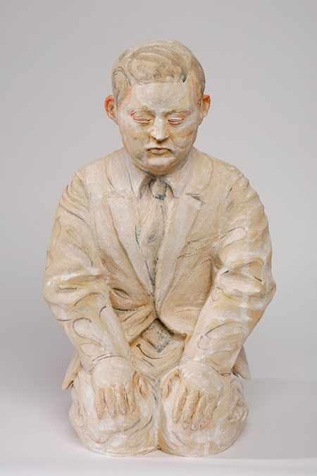Takamori, who died in January of pancreatic cancer at age 66, created his valedictory exhibition at James Harris Gallery, "Apology/Remorse," which opened the following month. Professor Emeritus at the University of Washington School of Art, Takamori's appointment guaranteed the leading role of the UW as an undergraduate and graduate center for promising ceramists. His final show was his most timely and topical. Drawing from news coverage of the 70th anniversary of the end of World War II, Takamori focused on German chancellor Willy Brandt's momentous kneeling at the Warsaw Ghetto Uprising monument in 1970. This crucial act was a central event of the Cold War. Takamori's ceramic sculpture dresses the German in a samurai robe. Similarly, a drawing and a sculpture depict current Japanese Prime Minister Shinzo Abe apologizing for Japan's wartime deeds. In another gender twist, Takamori set men's heads on female nudes meant to resemble idealized Greco-Roman Venus statues. Men's control over women's bodies is brought to mind, as is divided sexuality within each person. The Japanese-born artist's attitude toward glaze — thin and dripping — links his ceramics to the works on paper and unifies his entire oeuvre. A lifetime devoted to depicting the human condition ended on a compassionate note of strong artistic achievement and political reconciliation.
